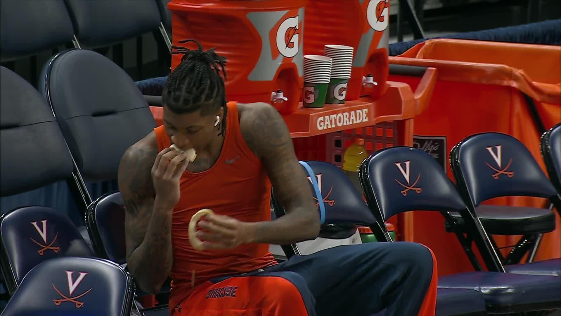 Syracuse’s Donnie Freeman shows off his unique way of eating an Uncrustable.