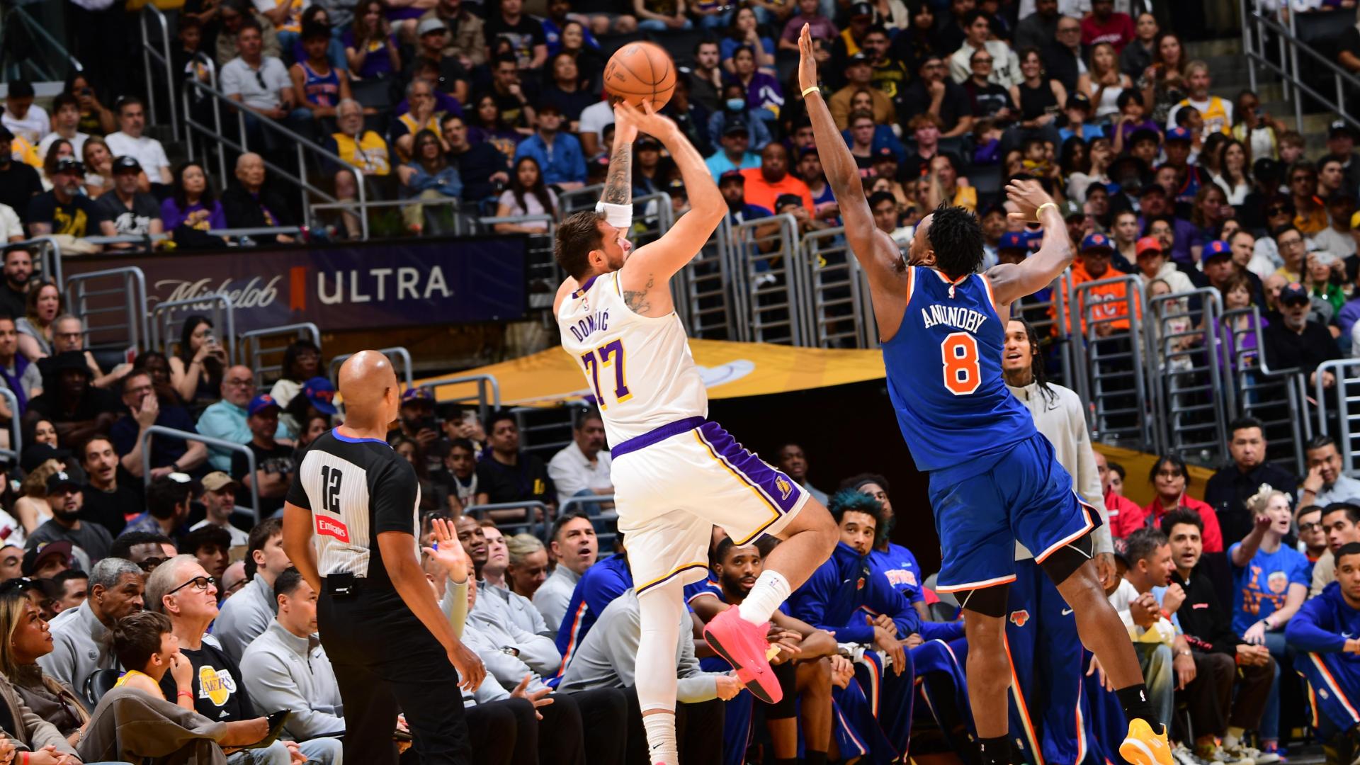 Luka Doncic knocks down a winning jumper from the baseline with 0.5 left in overtime for the Lakers.