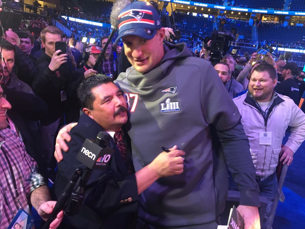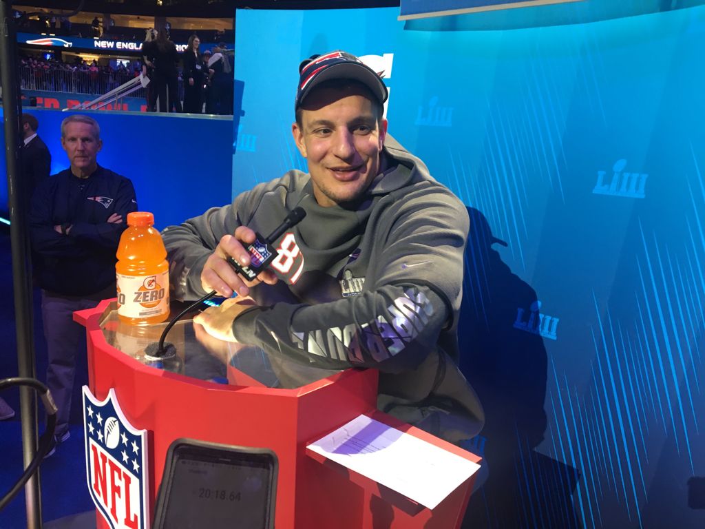 Patriots TE Rob Gronkowski asked if he's bummed not to be able to go to Shaq's Super Bowl party on Friday night. Gronk joked about plans to go to the party, if invited.