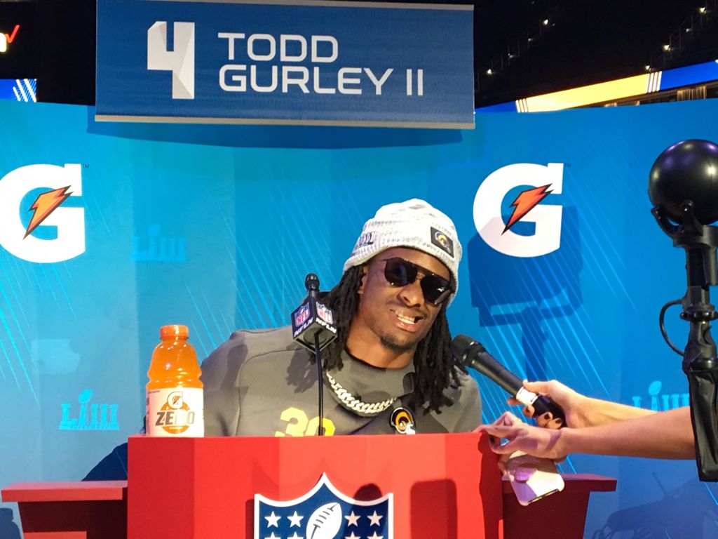Todd Gurley, a Georgia alum, talks about how much it means to him to be back playing in the same state as his alma mater. He said he hasn't been in touch with fellow Georgia alum Sony Michel of the Patriots, but is happy for him.