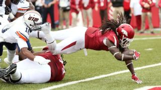 Alex Collins would like to remind everyone that there are running backs in the SEC not named Leonard Fournette and Derrick Henry. Arkansas’ talented junior scored a career-high five rushing touchdowns in a 63-28 rout of UT Martin on Saturday. He’s now up to 11 touchdowns and is just 40 yards shy of the 1,000-yard mark this season. After starting off 1-3 and falling out of the polls, the Razorbacks accomplished two firsts against the Skyhawks: their first winning streak of the season and their first time reaching .500 in the win-loss column.  What the win means for Arkansas: They’re not going to get back into the SEC West race. That ship has sailed. But by getting back to .500 and winning two in a row coming out of the bye week, the Razorbacks have some momentum heading into the home stretch of the season. As long as there aren’t anymore significant injuries and Brandon Allen continues playing well under center, they have a chance to play the role of spoiler with No. 19 Ole Miss up next and No. 4 LSU to follow. What the loss means for UT Martin: You’re 5-2, a 37-point underdog and you’re playing on the road. So what is the one thing you can’t do if you’re trying to pull off an upset? That’s right, turn the ball over. And UT Martin just couldn’t hang onto the football. Quarterback Jarod Neal had one interception and WR William Tanner made it two picks before the first quarter was even over, putting his team in a hole it couldn’t climb out of. Play of the game: Tight ends aren’t supposed to be this athletic, especially those that are as big and block as well as Arkansas’ Hunter Henry. But then Henry goes and makes a catch like this, reminding everyone that he’s the total package. Unsung hero: His numbers didn’t jump off the page, but Jared Cornelius' mere presence had to be uplifting for Arkansas. When he injured his forearm against Texas Tech on Sept. 19, it didn’t seem likely that he’d come back after only four weeks away. But there he was on Saturday against UT Martin in the starting lineup. The sophomore from Louisiana caught four passes for 33 yards, giving Allen another playmaker at receiver where he so desperately needed one considering the injuries to Keon Hatcher and others.