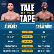 The reason I give Crawford a chance is because Canelo is not a big 168-pounder. I mean, Canelo has been fighting at that weight, but he's not a natural big guy. The question is how Crawford will adapt to the weight. If he adapts well enough to the size, I believe he can win. And another reason why I give Crawford a chance is because Canelo gets tired; he starts fading after six, seven rounds. If Crawford fights smart enough, I believe he's got the style -- an elusive style, not a one-dimensional style -- to beat Canelo. Don't engage with Canelo, be smart, win by points. I believe Crawford can pull it off.