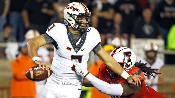 On paper, Oklahoma State has the better chance of ending its rivalry losing streak. Caesars gives the Cowboys a four-point edge, which befits the way they have played of late. Since a 24-21 loss at Iowa State on Oct. 23, they have outscored four opponents by an average of 41-6. The offense, an early-season albatross, has perked up a bit, and on a per-drive basis, the defense ranks second in points allowed and third in yards. The Pokes generate massive pass pressure without blitzing much -- seventh in pressure rate, second in sack rate -- and play the most physical man coverage that the officials will allow. (How much the refs allow varies from game to game.) The offense's job is to move the chains a couple of times before punting, tilt the field and wait for opportunities.