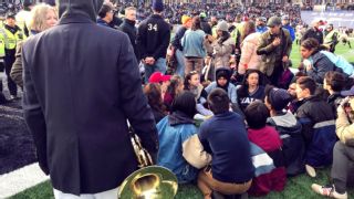 Spectators rushed the field to stage a climate change protest at halftime of Saturday's Harvard-Yale game, delaying the start of the second half by nearly an hour and causing the game to finish in near-darkness. The 136th edition of The Game between the Ivy League rivals went to halftime around 1:40 p.m. ET, and students from both schools occupied midfield after the Yale band finished performing. Most protesters left after about an hour when they were escorted off by police, who then told about two dozen who remained they were under arrest. The field was ultimately cleared, and the game resumed at 2:48 p.m. ET. However, the delay led to an issue for the game's finish because the Yale Bowl lacks stadium lights, and sunset in New Haven, Connecticut, was set for 4:26 p.m. on Saturday. The darkness problem was compounded as the game went to double overtime, but Yale ultimately got a stop to win 50-43 -- and secure a share of the Ivy League title -- at 4:38 p.m., before it became too dark to play. In a statement, the Ivy League referred to the protest as "regrettable." Yale said that while it "stands firmly for the right to free expression," it had issues with how the protesters went about their demonstration. "The exercise of free expression on campus is subject to general conditions, and we do not allow disruption of university events," Yale said in its own statement.  Yale coach Tony Reno said the unusual interruption was an example of what has made his university's rivalry with Harvard stand the test of time. "It's what makes Yale Yale," Reno said. "Our group, I'm sure if you asked them and the Harvard guys what makes it special, it's not only the game of football. It's the passions." Players were stretching and warming up when the protesters first took the field. Police in yellow vests lined up alongside the sit-in but did not intervene. When the 15-minute halftime expired and the protest continued, the players returned to the locker room as dozens more fans streamed onto the field to join in. Fans remaining in the stands began to boo, but only briefly. The public-address announcer implored the group to leave, repeating, "As a courtesy to both teams, the game must resume." Protesters responded by chanting, "OK, boomer." Yale police Chief Ronnell Higgins spoke to the protesters over a megaphone, trying to convince them that they had made their point but it would be lost if the situation escalated. Some protesters held banners asking their universities to act on climate change and Puerto Rico debt relief, including one sign that read, "Nobody wins. Yale & Harvard are complicit in climate injustice." Another read, "This is an emergency." "Hey, hey, ho, ho, fossil fuels have got to go," some protesters chanted. Some protesters had tied themselves together and were requesting police to arrest them, according to reporting by ESPN's Jack Ford. After about an hour, police formed a line and moved forward from the Yale sideline toward the Harvard sideline. A protest leader encouraged all "internationals" to leave. An agreement was reached to escort those remaining off, with one police officer to every two protesters. Those who did not leave then were informed by Higgins that they would be arrested. Between 20 and 30 protesters were arrested, according to protest organizers. Rachel Sadoff, a junior at Harvard, said about 150 students from the two universities planned to participate in the protest. She said about 100 more students who had been sitting in the stands joined in, and that those arrested were released and given a court date. Caleb Schwartz, a Harvard student and spokesman for the group Divest Harvard, said Saturday's protest was the result of months of coordination. "This is a very deliberate choice of targeting this specific [game] to get our action out there," Schwartz told ESPN's Paul Kix. Information from The Associated Press was used in this report.
