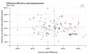 And it's not as if the offense hasn't tried. Gunner Stockton has thrown seven passes at least 20 yards downfield, but he has completed just one. Granted, he has completed 76% of all his other passes, and Georgia has been pretty efficient. But the big-play spigot needs to open pretty quickly.