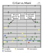 The Aggies scored 40-something and allowed 20-something against both UTSA and Utah State. Notre Dame isn't much of a "track meets" kind of team, and Carr threw almost all of his passes close to the line of scrimmage against Miami. But he connected on both of his long passes. Might the Irish get aggressive and test A&M's glitchiness?