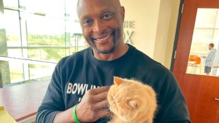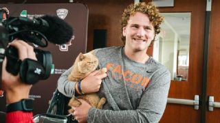 BOWLING GREEN, Ohio -- The biggest brands in pet care have courted him with swag boxes. He travels with a security detail and is cashing in on his own merch line. Hotels that ban animals bend the rules when he arrives. EA Sports even built him into its video game. Who could've guessed one of the breakout stars this college football season would be a cat? Meet Pudge, the 3-year-old exotic shorthair Persian who's now the smushy face of Bowling Green. Boosting morale in the locker room and on the sidelines, Pudge has helped propel the 2-1 Falcons to their best start in 11 years, highlighted by Saturday's 23-13 upset of Liberty. Pudge belongs to Bowling GreenĀ starting long-snapper George Carlson, who had no idea his orange-coated companion would turn into a campus celebrity. "He's become part of the family," said Eddie George, Bowling Green's first-year head coach. The former Tennessee Titans star is allergic to cats, yet even he rubs Pudge's back and has FaceTimed him with his kids. Pudge has also won over George's wife, singer Tamara Johnson-George, now one of his biggest fans. Pudge's rapid rise to fame began last month. On an off day after a notably grueling practice, Carlson brought him to the facility and set him at his locker. As Carlson's teammates trickled in for treatment and lunch, Pudge stole the show. "When I saw Pudge I was super stoked," fullback Leo KempĀ said. "He was such a spirit lifter." Wide receiver Finn Hogan, who already had a sizable social media following, posted a video of Pudge with the caption: "Fall camp so rough we got a locker room cat. Emotional support animal." The Instagram reel generated 2 million views.  Days later, Kemp uploaded a TikTok video of Pudge and wrote "Y'all might have a 300 million dollar facility. But do you have a locker room cat?" It drew more than 300,000 likes, with comments from the Detroit Lions and Minnesota Vikings accounts, lamenting why they hadn't thought to have a locker room cat first. Pudge kept going viral -- and his Q rating soared. "People just absolutely love him," Carlson said. Bowling Green's marketing team sensed opportunity, offering fans a "Pudge" two-game ticket package: midfield seats to the Liberty game and to Central Michigan on Oct. 18. The Falcons featured him on the "Simba Cam" during the season-opening victory over Lafayette. When a marketing intern lifted Pudge above her head on the sideline, the home crowd erupted. Bowling Green secured him an all-access pass to its Week 2 trip to Cincinnati. Assistant athletic director Taylor Jefferson wore a "Pudge Security" shirt while escorting him around Nippert Stadium. "I was never expecting Eddie George to take a backseat to any kind of storyline," Jefferson said of the 1995 Heisman Trophy winner. "But it's all about Pudge now." Carlson's father, Jim, a veterinarian in McHenry, Illinois, drove Pudge to Cincinnati. He was looking for a pet-friendly hotel. But when the team hotel learned Pudge was in town, it waived its no pets allowed rule. The morning of the game, George Carlson left Pudge in his room to eat breakfast with the team. But running backs coach Brian White sent him upstairs to get Pudge, so the cat could lap up "championship water" with the team. Life as a feline phenom comes with perks. Both Temptations and Purina mailed him care packages, loaded with tasty treats. Pudge recently had a meet-and-greet at a Toledo Mud Hens minor league baseball game, and he's been invited to appear at the International Cat Show & Expo in Cleveland next month. An apparel company signed him to an NIL deal -- and Pudge shirts, hoodies and jerseys have already generated more than $1,500 in royalties. Before kickoff Saturday, Bowling Green threw a Pudge tailgate party, where fans lined up for selfies. "I'm just blown away by the popularity of him, but he's such a good sport about it," Jim Carlson said. "Cats aren't usually that social, and the fact that he is has just been magical." EA Sports added him to College Football 25, where the "Pudge the Cat" ultimate team card provides a +1 toughness increase. The Falcons found out when one of the players stumbled onto the card while playing. "He sent us a picture of his TV to our group chat -- and he's like, 'Uh, Pudge is in the video game?'" Hogan said. "Like no way they put Pudge in the game. We were all laughing." Pudge has kept the Falcons laughing these past few weeks. But a year ago, he helped carry his owner through the toughest time of his life. Cristen, George's mom, was the one who found Pudge -- though she never got to see how famous he'd become. In 2021, Jim and Cristen traveled to Tennessee for their son's first game with the Falcons. Cristen felt ill afterward and thought she caught COVID. But while treating her, doctors found something else: Stage 4 ovarian cancer. The diagnosis was devastating for the Carlsons, especially for George. The two were close, talking every day after he left for college. "They had a special bond," Jim said. Cristen helped make George's dream of playing college football possible. George was an offensive lineman in high school, but knew he'd never be big enough for the next level. So Cristen found a trainer to teach him how to long-snap. "I wouldn't be here playing [at Bowling Green] without her," he said. George and his sister, Avery, grew up on a small farm. Cristen, a former TV meteorologist who gave up her career to help Jim with the clinic and raise their kids, was always bringing home animals -- goats, pigs, cats. Jim couldn't bring himself to put down the cats their owners no longer wanted, so the Carlsons kept them, too. "I can't recall a time that we never had a cat," Jim said. "We were foster failures -- we kept them their whole lives."  George shared their love for cats, namely the Persians with flat faces. While battling cancer, Cristen made it her mission to find him one. So two years ago, in a Chicago parking lot, she and Jim met a woman riding a scooter with a kitten in a bask