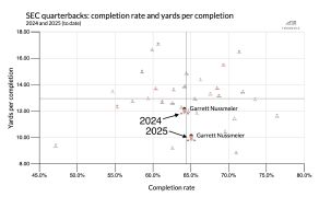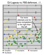 If DJ Lagway threw only three interceptions against LSU, the Gators might have scored an upset. That's a positive, right? He instead threw five in a 20-10 loss, but the Florida defense still gave the Gators a chance. It has allowed only 38 points in three games. The offense has scored only 26 in two FBS games. Opponents aren't afraid of the run game, receivers aren't getting open, and Lagway is developing some pretty extreme tendencies in passing to specific areas of the field (as evidenced by all the green "completion" dots along the right sideline on this chart):  Four of Lagway's six 2025 interceptions have come on third-and-long, and a fifth came in a last-ditch drive against LSU. He's trying desperately to make something happen, and it's bringing out some terrible tendencies. Miami quarterback Carson Beck has been good, and he has gotten the help Lagway hasn't, from his offensive line and his receivers. But the Florida defense could make this one interesting if Lagway can take what he's given by a Miami defense that ranks 83rd in yards allowed per dropback. Current line: Miami -7.5 | SP+ projection: Miami by 10.6 | FPI projection: Miami by 7.2  Syracuse at Clemson (noon, ESPN)