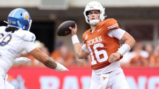 It almost looks like paralysis by analysis for Manning. He has been raised as a perfect quarterback specimen and knows every passing angle, and he seems to freeze up while considering what to do sometimes. He averages 3.1 seconds to throw (seventh most in the country), and he is 100th in interception rate (2.8%) and 96th in completion rate (61.3%). Texas' defense will buy him development time, and things could click at any moment, but they haven't yet.