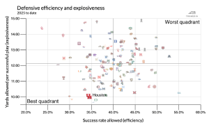 Texas Tech has been genuinely awesome this season, walloping three bad teams as an elite team should and then physically manhandling Utah in Salt Lake City two weeks ago. They've been awesome at pretty much everything -- they're fifth in yards per play on offense and defense -- and aside from a predilection for penalties and some injury-prone tendencies for quarterback Behren Morton, we don't really know their weaknesses yet. Houston's a little bit easier to figure out. Defense: good. Offense: not so much. The Cougars are ninth in yards per play allowed and are very much in the best quadrant of this chart.  Willie Fritz lost defensive coordinator Shiel Wood to Tech, but the UH defense has been even better with replacement Austin Armstrong. But the Conner Weigman-led offense remains a work in progress. The Coogs go three-and-out nearly 39% of the time (124th), and that will probably be their downfall in this one. But if the defense sets up some easy scoring opportunities, this one quickly moves into "upset watch" territory. Current line: Tech -10.5 (down from -12.5 on Sunday) | SP+ projection: Tech by 13.9 | FPI projection: Tech by 7.0  No. 14 Iowa State at Cincinnati (noon, ESPN2)