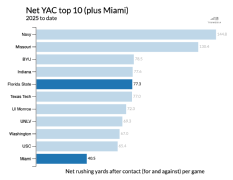 In some ways, you could say that Florida State was flying a little too high. The Seminoles had been nearly perfect in 2025, manhandling Alabama and humiliating two buy-game opponents (East Texas A&M and Kent State), and they were due a bad break or two. The defense hadn't faced a tough and efficient run game like Virginia's (including Alabama's), and the offense had faced barely a down of adversity. Regression ran its course in Charlottesville last Friday night, when FSU lost an early fumble, gave up an acrobatic red zone interception and saw a juggling overtime touchdown catch go incomplete by millimeters. Stuff happens. Even in the playoff era, though, a "stuff happens" loss can wipe out your margin for error. Thanks to early-season collapses from Clemson and Florida, Miami is the last SP+ top-40 opponent on FSU's schedule, meaning this is likely the Seminoles' last chance at another high-visibility win. On paper, this one's awfully even. Miami has its own solid, physical run game like Virginia's, one with a bit better blocking but fewer yards after contact. The Hurricanes also have Carson Beck and a passing attack that rules third downs. It's lacking explosiveness -- Beck is averaging just 11.9 yards per completion -- and therefore doesn't generate loads of easy points. But it's an efficient attack, and FSU's defense has allowed a few more third-and-long conversions than is preferable. With how well Notre Dame's offense has played since, Miami's Week 1 defensive performance against the Fighting Irish (24 points and 5.4 yards per play allowed) looks awfully impressive. But FSU's offense has quite a bit to offer, even with the misfires against Virginia. The Seminoles rank first in points per drive and second in yards per play. Virginia hemmed in quarterback Tommy Castellanos and forced him to throw instead of making plays on the perimeter -- it's the key to keeping a lid on a Castellanos attack -- but FSU still scored 35 points in regulation and averaged 6.4 yards per play. The ceiling is high even if teams defend the Noles correctly. Gavin Sawchuk and Ousmane Kromah average a combined 5.8 yards per carry with a 59% success rate, and Duce Robinson and Micahi Danzy have combined for 24 catches and 514 yards. And this is still one of the best Net YAC teams in the country.  Considering Miami took down Florida in part due to physical running, whoever generates more success in this regard could have a huge advantage. With tackle Rueben Bain Jr. at full force and getting help from disruptors such as linebacker Mohamed Toure and nickel back Keionte Scott, Miami's defense might be even better than Bama's. It will land some shots, but if FSU can hold Beck and the Canes to 24 or fewer points, you have to like the Seminoles' chances. Current line: Miami -4.5 | SP+ projection: Miami by 2.1 | FPI projection: Miami by 3.9  No. 24 Virginia at Louisville (3:30 p.m., ESPN2)