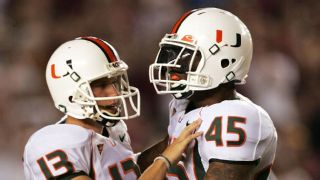 2000: Miami 27, Florida State 24After 1992, the haunting of Wide Right would disappear for an eight-year stretch, but its legacy wasn't complete. The 2000 edition of Florida State-Miami brought Wide Right III. With four minutes remaining in the rivalry game, the Hurricanes led 20-10. Then things got crazy -- the Seminoles scored two touchdowns in just under two minutes of game time to take the lead, before the Hurricanes found the end zone themselves to regain the lead with 46 seconds remaining. Florida State still had time to get to the edge of field goal range, with Matt Munyon attempting a 49-yard try as time expired. It went wide right. "Wouldn't you know it?" legendary Florida State coach Bobby Bowden remarked after the game. "He's been wide left all year, and then that happens. We had him out there pretty far, though."