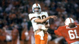 A smaller private school in Coral Gables with a nondescript football history, Miami famously considered dropping the sport in the late-1970s. It hired Howard Schnellenberger instead. Good call. The Hurricanes won nine games in both 1980 and 1981, but a 7-4 campaign in 1982 threw everyone off the scent once more, as did the fact that they headed into 1983 with a redshirt freshman (Bernie Kosar) at QB and lost their opening game, 28-3, at Florida. They won their next eight by an average of 36-8, however, and after comfortable wins over both No. 13 Notre Dame and No. 12 West Virginia, they suddenly found themselves in the top 5 for only the second time ever. And with a shocking 31-30 upset of an all-time great Nebraska team in the Orange Bowl, they completed one of the sport's most unexpected title runs, one they backed up with three more national titles over the next eight years.