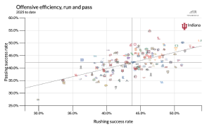 Granted, Oregon's win at Penn State two weeks ago looks a little different after the Nittany Lions' loss at winless UCLA, but it seemed to give us a pretty accurate impression of the Ducks: They're super efficient with quarterback and current No. 2 Heisman betting favorite Dante Moore leading the show on offense, but they're not incredibly explosive. The defense combines three-and-outs -- they've forced them on 50.9% of possessions, third in the FBS -- with elite big-play prevention. I mean, of course this is an awesome team: It has won 19 of 20 games! The spotlight, then, is on Indiana. Can the Hoosiers perform better than they did at Ohio State (38-15 loss) or Notre Dame (27-17) last year? They haven't really given us any reason to doubt them in 2025: They're third in SP+; they're first in success rate* on offense and second on defense; and they beat a current top-20 team (otherwise-unbeaten No. 17 Illinois) by 53 points three weeks ago. (* Success rate: how frequently an offense is gaining 50% of necessary yardage on first down, 70% on second down, and 100% on third and fourth downs.) The offense generates most of the headlines, with quarterback and No. 7 Heisman betting favorite Fernando Mendoza throwing to Elijah Sarratt and Omar Cooper Jr. and handing off to Roman Hemby and Kaelon Black. The Hoosiers have a lot of ways to stay on schedule, and they've done it better than anyone else in the sport thus far.  Aside from the occasional big-gainer to Cooper, explosiveness isn't necessarily a strength here, and the two teams that kept the big plays tamped down -- Old Dominion and Iowa -- held them to 23.5 points per game and 5.6 yards per play. The Hoosiers' defense is the star of the show, though. Illinois scored 10 points at 3.6 yards per play against Indiana but has averaged 42.4 points and 7.0 yards per play against everyone else. Everywhere you look, Indiana has multiple stars, with ends Kellan Wyatt, Mikail Kamara and Stephen Daley; linebackers Isaiah Jones and Rolijah Hardy; and safeties Louis Moore and Amare Ferrell. Plus star corner D'Angelo Ponds is expected to play after missing time with injury. The Big Stage Game is the only test Indiana didn't pass last year, but the Hoosiers get another chance to show out Saturday. We know Oregon will. Current line: Ducks -7.5 | SP+ projection: Ducks by 6.2 | FPI projection: Ducks by 5.2 The Meat Lovers Crunch Wrap Calzone of the Week (might be new and different, might taste like a typical calzone)
