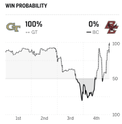 10. Mercer (9-1): 20.0 There's a 3.5-point drop-off to No. 11 Rhode Island, but at least nine teams will be able to talk themselves into a potential national title game run, at least if they don't land on NDSU's side of the 24-team bracket. And even with its defense struggling Saturday, Harvard is among those contenders. 4. No. 11 Oklahoma 23, No. 4 Alabama 21. South Carolina over A&M would have been a massive upset. This one was still pretty big, though. It was familiar, too. One of my go-to measures is what I call postgame win expectancy (PGWE). It takes a look at the predictive stats a game produces -- the stuff that eventually feeds into SP+ -- tosses them into the air and says, "With these stats, Team A could have expected to win this game X% of the time." By PGWE, Alabama's loss to Vanderbilt last season was the least likely defeat of the season.  Against the Commodores, Bama had a comfortable success rate advantage (55.6% to 42.7%) with bigger big plays (yards per play: Bama 8.8, Vandy 5.6), fewer negative plays, more goal-to-go situations, you name it. Vandy won with perfectly timed bursts and turnovers that included a perfectly deflected pick-six into the arms of Randon Fontenette. Based on the game's stats, Bama would have won 98.5% of the time. But with a 1.5% chance, the Commodores won. Combined with a late egg-laying at Oklahoma, it contributed to the Tide falling short of the CFP. Against Oklahoma on Saturday, Bama produced a massive success rate advantage (46.7% to 27.5%) with fewer negative plays and, despite a massive field position disadvantage, more goal-to-go situations and the same number of red zone trips. The Tide's PGWE against the Sooners: 95.2%. OU was going to need defensive heroics (such as an 87-yard Eli Bowen pick-six) and special teams explosions (such as a 42-yard Isaiah Sategna III punt return and a tipped field goal before halftime) to win this one. Guess what they got? Thanks to an earlier run of ranked wins, the two-loss Tide are still comfortable in this year's playoff hunt -- they'll probably have to suffer an Iron Bowl defeat to an interim-coached Auburn team to fall out of contention (and nothing wild and unexpected has ever happened in the Iron Bowl before). But with the loss, they fall from Tier 2 to Tier 3 in my playoff tiers. In addition to the top two ACC contenders and one-loss BYU, they're joined in Tier 3 by the team that just beat them. CFP Tier 3 odds: Alabama 58.6%, BYU 50.2%, Oklahoma 41.7%, Virginia 41.7%, Georgia Tech 36.6% Combined with Georgia's comfortable win over Texas, Bama's SEC title odds took a bit of a hit too. SEC title odds, per SP+: Georgia 33.0%, Texas A&M 31.5%, Alabama 30.0%, Ole Miss 5.4% I'm guessing Bama fans have seen their team win enough SEC titles through the years to get a little spoiled -- they're probably more interested in CFP odds. Still, this remains an interesting race. 5. Division II: Lenoir-Rhyne 48, Catawba 46. On a beautiful, 67-degree fall day in Hickory, North Carolina, 4,987 fans saw the home team blow an enormous lead and win anyway. Lenoir-Rhyne went up 42-12 with 4:29 left in the third quarter, then watched Catawba unleash a 34-0 run over the following 18 minutes. Amari McArthur's 87-yard catch-and-run (!) made it 46-42 Catawba with 1:14 left, but Khamoni Robinson completed four passes, then charged 13 yards into the end zone with six seconds remaining. 6. No. 16 Georgia Tech 36, Boston College 34. After last week's chaos, Georgia Tech and Virginia entered Week 12 atop the ACC hierarchy. Virginia played maybe its best game of the year in a surprisingly easy 34-17 win over Duke in Durham, but Tech thought long and hard about going ker-splat in this one.  BC, which played good ball in losses to Louisville and Notre Dame before face-planting last week against SMU, brought its A-game back in this one. Despite yet another ridiculous day from Tech's Haynes King -- 371 passing yards, 61 non-sack rushing yards -- the Yellow Jackets found themselves trailing 28-17 heading into the fourth quarter. Jordan Allen's 54-yard score gave Tech the lead, but Turbo Richard responded with a 43-yard burst to make it 34-33 Eagles. BC missed the 2-point conversion, however, and that loomed large when King drove the Jackets 68 yards in four minutes and set up Aidan Birr's chip-shot field goal for the win. Virginia and Georgia Tech boast the best title odds at the moment, but both still have work to do. ACC title odds, per SP+: Virginia 41.3%, Georgia Tech 27.1%, SMU 17.2%, Miami 6.1%, Pitt 5.2%, Duke 3.0% Virginia, 6-1 in conference play, can clinch a spot in the ACC championship game with a rivalry win over Virginia Tech in two weeks (projected win probability, per SP+: 88%), while 6-1 Tech has a trickier game against Pitt next week (55%). Pitt, 5-1, likely has to beat both Georgia Tech and Miami (15%) to have a shot, and SMU, 5-1 without playing either Virginia or GT, has to beat Louisville and Cal (44%) to remain in the mix. Miami lurks at 4-2 -- the Hurricanes don't have a great shot of sneaking in, but they'll be the favorites if they get to Charlotte. 7. Division III: Merchant Marine 39, Coast Guard 38. "College GameDay" at Pitt was pretty fun, but if I were in charge of locations -- and it's probably good that I'm not! -- I would have sent Rece and the guys to ... Fenway Park. That's where the 8,966 in attendance for the Secretaries' Cup saw maybe the most back-and-forth game of the weekend. Neither team led by more than five in the second half, and after Harrison Hensley gave Coast Guard the lead with 6:52 remaining, Merchant Marine quarterback Bubba Mustain scored from 7 yards out with just 20 seconds left to give the Mariners the win. Mustain on the day: 46 carries for 274 yards and three touchdowns, plus 6-of-8 passing for 150 yards and another two scores. Goodness! Give him an honorary 10 points in my Heisman of the Week section below. 8. No. 18 Michigan 24, Northwestern 22. This one changed in a blink. Jord