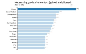 Yards per successful play: Oregon defense first, USC offense 11th (*Success rate: How frequently an offense is gaining 50% of necessary yardage on first down, 70% on second and 100% on third or fourth.) USC's Jayden Maiava still ranks first nationally in Total QBR, as he has for most of the season. His combination of sack avoidance and big-play passing is rare -- only 9.9% of pressures on him become sacks (fifth among power-conference QBs) and he averages 14.3 yards per completion (fourth). In Makai Lemon, Maiava has an all-around star at receiver -- he has made 61% of his catches out of the slot and 35% lined up wide, and though he does a lot of damage from screens, hook routes and other short passes, he also has caught 14 of 19 passes for 517 yards and three touchdowns on balls thrown 20-plus yards downfield. He has an elite catch rate at nearly every level.  Last week, against the best defense USC has faced this season (Iowa), Lemon caught 10 passes for 153 yards. Now comes the new best defense the Trojans have faced: Oregon ranks third in defensive SP+ and second in yards allowed per dropback. The Ducks have yet to give up more than 5.3 yards per play in any game. USC has yet to average less than 5.5. That will be a great matchup, but whether this is a great game depends on USC's defense. At 37th in defensive SP+, it's comfortably the best group Lincoln Riley has fielded in Los Angeles, but against the only two top-20 offenses they've faced, per SP+ (Illinois and Notre Dame), the Trojans gave up 34.0 points per game and 7.2 yards per play. Oregon ranks 10th in offensive SP+. The pass defense is solid, but the Trojans rank 126th in rushing success rate allowed and 103rd in stuff rate (run stops at or behind the line). That's pretty scary against an Oregon team that has grown hit-or-miss through the air but almost always brings it on the ground. In the past five games, with his receiving corps struggling through injuries, Dante Moore's Total QBR has been under 42.0 three times and over 91.0 twice. But the Ducks are second nationally in both rushing success rate and yards per carry, and they have endless depth at running back: Four backs have rushed at least 42 times, and three (Noah Whittington, Jordon Davison and Dierre Hill Jr.) average at least 7.0 yards per carry. Teams can make stops if they force Moore to constantly make plays on passing downs, but it's hard to guarantee USC will ever knock the Ducks off schedule. Current line: Ducks -9.5 | SP+ projection: Ducks by 10.6 | FPI projection: Ducks by 6.0