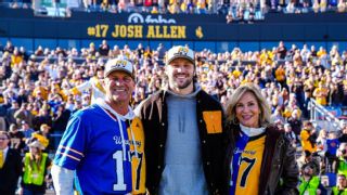 LARAMIE, Wyo. -- The fans at War Memorial Stadium were a bit distracted as the clock ticked down to halftime. Nevada had taken a 7-0 lead over Wyoming, but it was who had walked onto the sideline that had a lot of the sold-out crowd's attention. Josh Allen, joined on the field by his parents, Joel and Lavonne, and former Wyoming coach Craig Bohl, was back in Laramie for the first time since his Pro Day in 2018. This time, he took the field as the last Cowboy football player to wear No. 17. Allen had his jersey retired at halftime of the game on Saturday, the third athlete in Wyoming history to have that honor (the other two are former men's basketball players Fennis Dembo and Kenny Sailors). A video was shown of Allen's highlights at the school, and then his name and number were revealed on the middle deck of the stadium.  "First off, I just want to say thank you for everybody coming out tonight. This is such an amazing honor, a huge blessing," Allen said during the ceremony. "There's so many people that I can thank for this achievement. A lot of teammates here. Love you guys. "Coach Bohl, coach [Brent Vigen], people that believed in me. The fans, and the support here in Wyoming. I'm so honored and blessed to represent this university and this beautiful state. I love you guys. Thank you. God bless. Go Pokes, and it will always suck to be a CSU Ram."  The Bills have a weekend off after losing to the Houston Texans on "Thursday Night Football." Allen spoke to and spent time with the football team on Friday night and spent time on the field before the game with the fans. Allen's wife, Hailee Steinfeld, and a variety of former Cowboys teammates were also in attendance. Wyoming went on to lose the game. 13-7. "Well, it's quite emotional. I was emotional," Bohl told ESPN of the ceremony. "His mom and dad. Josh was. He had such an impact on this program and the state. Certainly, the recognition he deserves is heartwarming, and making a difference."