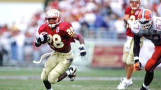 Justice is on the short list of greatest players never to win the Heisman. As a junior, he finished second to fellow junior Doak Walker of SMU. As a senior, he finished runner-up to Notre Dame end Leon Hart. "Choo Choo" Justice had to settle for being a two-time All-American and a Tar Heels legend. His school total-offense record (which doesn't include 1,794 return yards or his 42.6 punting average) stood for 45 seasons. His stature in North Carolina athletics will never diminish. A statue of him stands outside Kenan Stadium. Inside, the 22-yard lines are painted Tar Heel blue.  134. Warrick Dunn (RB, Florida State, 1993-96)