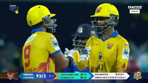 - 4th Wicket: 50 runs in 38 balls (B Indrajith 27, Adithya Ganesh 19, Ex 4)