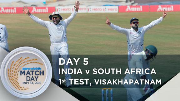 Driving through the line did end up costing him in the end, when Shami returned and found some late swing in the corridor to take the inside edge on to the stumps. There was some more frustration for India - Rabada had a few successful swings against Jadeja too, and Muthusamy's outside edge drew him closer to the fifty on debut that he eventually did not reach, having run out of partners.