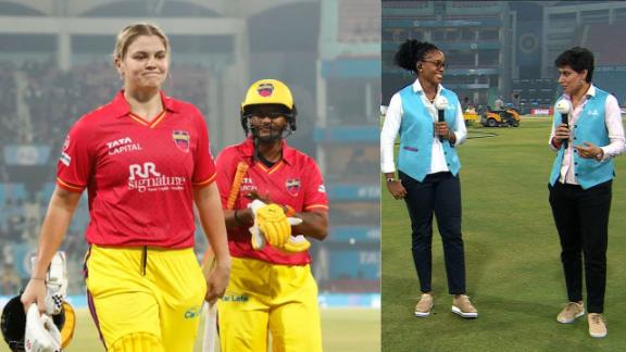 - BATSMENRBM4s6sSR7.1 a gift of a wicket for RCB! Oh, no. Harris was looking mighty dangerous. Don't think the third umpire was even needed there. because the throw from cover was cleanly collected by Warehem as she broke the bails. Good stop and throw by Mandhana. Harris had nowhere to go but the dressing room once she was sent back by Voll. 77/112.2 There's the breakthrough! Navgire went for the glory hit to get to the fastest fifty in the WPL. Got more height than distance. It was tossed up wide outside off, she looked to get on a knee and go over the on side. Only skied it high to long-off, end of the 31-ball 71-run stand 148/216.3 A second wicket for Wareham and the dangerous Henry is out of here! Shortish and spinning away outside off, she goes deep in the crease and slaps it to Mandhana at cover-point 191/319.4 Cleaned her up! Dean win the English battle. Spears it full and straight on the stumps, Ecclestone looks to go across the line, misses on the inside and sees the middle stump pegged back 223/419.6 Voll denied a century, she finishes 99 not out! Ohhh, these fine margins. She joins Sophie Devine to equal the highest individual score in the WPL. Dean fires it full, she can only drill it as far as mid-on, who fires a quick throw to Ghosh seeing Deepti charge back for the second. She turns back but it is too late as Ghosh catches her short. UPW finish on 225 for 5, the highest total in the WPL 225/5Extras8 (lb 3, w 5)TOTAL225/5 (20 Overs, RR: 11.25)Fall of wickets: 1-77 (Grace Harris, 7.1 ov), 2-148 (Kiran Navgire, 12.2 ov), 3-191 (Chinelle Henry, 16.3 ov), 4-223 (Sophie Ecclestone, 19.4 ov), 5-225 (Deepti Sharma, 19.6 ov)