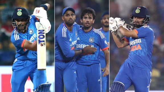 - BATSMENRBM4s6sSR4.5 Six and out! Fine comeback from Bishnoi. Hits the top of off stump. Seems like the wrong'un, Bishnoi's stock ball, on a length and fizzes away at quick pace to beat Head on the outside edge and disturb the furniture. Big wicket for India 47/22.3 Mukesh strikes with his third ball. Short and outside off, Philippe throws his bat at ball. But the ball isn't coming onto the bat on this two-paced Bengaluru surface. Philippe can only drag it back onto his own stumps 22/114.6 another full-toss outside off, McDermott can't clear long-off! Rinku takes it in the deep. Arshdeep misses the yorker once again, but gets lucky this time as McDermott miscues it 116/56.6 Two wickets in two overs for Bishnoi. He has Hardie holing out to long-on. Another wrong'un, breaking into off stump, Hardie drags it to long-on off the inner half 55/313.2 Axar comes back and takes out David. Back of a length and sliding into the hips, the ball isn't coming onto the bat. David half-heartedly picks it up and chips it in the air. Avesh runs in from deep square leg and snaffles a low catch, diving forward 102/416.3 Caught by Gaikwad at point. SKY, Gaikwad exchange wry smiles. Avesh misses the yorker, comes out as a low full-toss, which is sliced to point. Mukesh can't believe it either 129/619.3 Arshdeep has Wade holing out to long-on. Arshdeep attempts another yorker, marginally misses it, but it's still a decent delivery. Wade does not get enough elevation. Caught at Iyer in the deep 151/816.4 Mukesh storms through the defences of Dwarshuis. Back of a length, threatens to angle away outside off but seams back in to breach the weak defences and floor the middle stump. Double-strike from Mukesh 129/7Extras1 (w 1)TOTAL154/8 (20 Overs, RR: 7.7)Did not bat: T SanghaFall of wickets: 1-22 (Josh Philippe, 2.3 ov), 2-47 (Travis Head, 4.5 ov), 3-55 (Aaron Hardie, 6.6 ov), 4-102 (Tim David, 13.2 ov), 5-116 (Ben McDermott, 14.6 ov), 6-129 (Matthew Short, 16.3 ov), 7-129 (Ben Dwarshuis, 16.4 ov), 8-151 (Matthew Wade, 19.3 ov)