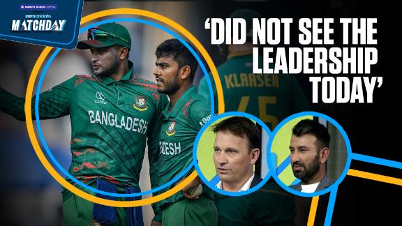 South Africa have shared the wickets among their bowlers all tournament, and now it was Gerald Coetzee's turn as Mushfiqur Rahim carved one straight down deep third's throat. Rabada would then get into the act as he trapped Litton Das in front, and Keshav Maharaj removed Mehidy as Bangladesh stumbled to 81 for 6.