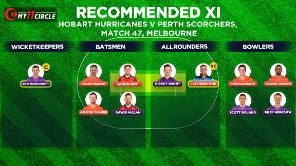 A fine, sunny afternoon in neutral Melbourne was more reminiscent of Perth than Hobart, and an ideal seeing day for the Scorchers' top order after Ashton Turner won the toss. Jason Roy was quickly into gear, taking 10 from Riley Meredith's first over and then lining up Scott Boland to set the Victorian on the path to an unflattering 0 for 48 from his four overs.