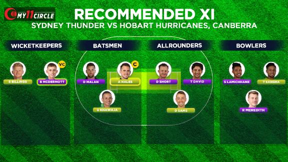 After being put in on a used pitch, the Thunder were off to a brisk start as Usman Khawaja and Alex Hales added 64 in 7.1 overs for the first wicket. While Riley Meredith found some extra bounce to trouble Hales, the runs came easily from the other end. Boland was taken for 18 in the second over of the game with Hales smashing him for a six and a four. Khawaja got into the act with a scooped four off Nathan Ellis as the Thunder ended the powerplay with 40 for no loss.