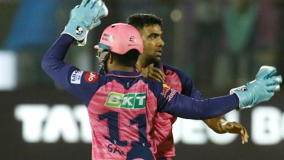 Ashwin will face a free-hit from Dayal from over the wicket. But Ashwin isn't entirely ready, as he asks the bowler to stop in his run up.