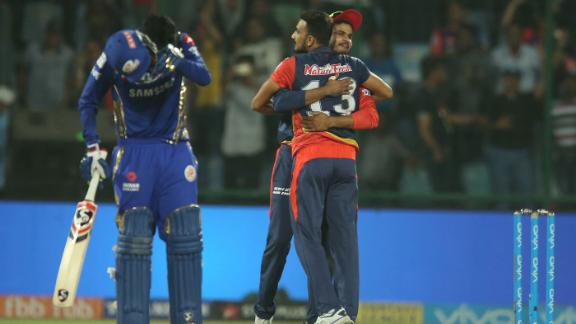 Evin Lewis was belting the Daredevils fast bowlers to all parts. He had been dropped on 8 and added another 40 runs when he ran past a googly from Mishra. It was exquisite cricket. The legspinner had been hit for six the previous ball but he trusted his strength - bowling slow and extracting turn from a helpful pitch - and sent back Mumbai's top-scorer. Mishra also took out their last remaining hope with an equally artful legbreak. He was in his last over, bowling at Hardik, who bulldozes spin bowling. Still, Mishra kept tossing it up. He helped himself by bowling it wide of off stump. The batsman swung across the line and was caught at point. And his team was on their way out.
