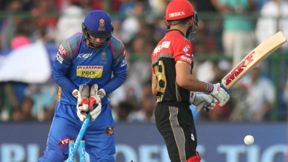 - BATSMENRB4s6sSR2.5 gone, Kohli's gone! This is a huge wicket for Royals. You got the feeling Kohli was playing for the 15.5 over requirement. Charges down the ground to force the pace, not quite full enough and he swipes only for the ball to spin in from a length and flatten the stumps 20/18.3 slides one across, Parthiv shapes to pull but this beats the underedge as he misses. In doing so, he dragged his back foot forward and it was on the line when the bails were whipped off. Stunning work from Klaasen. Parthiv's done his job though. 75/212.4 misreads the googly, gone. That could be the final nail in RCB's coffin this season? Class from Shreyas Gopal! Lands this outside off, AB is sucked into the drive, but is done in by the length as well as the ball rips back in to beat the inside edge. Klaasen is alert as he pulls off another superb stumping. 98/68.6 he's chipped this back to Shreyas, who leaps high to take an excellent return catch. The double-strike returns to stun RCB, the blue flags are out. The googly has done the trick. He's a short man, but timed his jump superbly. 77/310.3 there's the big wicket. Mandeep runs down under pressure to go over the top, beaten by sharp turn and Klaasen executes a straightforward stumping. Superb bowling, nicely tossed up him and deceived him in flight. Big moment in the match. 85/411.6 shapes to drive, doesn't get to the pitch, is beaten for turn, and gets a thick edge that has been taken beautifully by Rahane at slip. Excellent captaincy to have himself stationed there. Superb from Sodhi. Dragged him forward into the drive, deceived him in flight and thank you very much. RCB slide further. 96/515.1 stunning from Klaasen! Catch of the match. Sarfaraz looks to play a late cut, but strangely to another slower ball. Surely he can't be trying dinky strokes like those without pace to work with? Doesn't matter, he has to go. Klaasen's anticipation is top notch as he moves quickly to his right, dives low and puts his right hand out to pluck that inches from the ground. 108/717.6 he's got more elevation than distance, would've been six at Chinnaswamy but the boundaries in Jaipur are huge. Swung away and Gowtham takes a simple catch off the toe end at wide long-on. 128/915.2 the middle and off stump has been flattened. Right through Umesh's defence. Hits the hard length this time, he played all around it. Royals roar. 108/819.2 swung away, but this is a steepler towards deep midwicket. Sanju Samson is running IN, K Gowtham is running back from the ingield, the ball curves in the air and as it comes down, Samson oses balance and fumbles, but Gowtham has the presence of mind to take this on the rebound. Stunning win for the Royals. Bangalore boys Gowtham and Gopal have booted RCB out of IPL 2018. 134/10Extras3 (b 1, lb 1, w 1)TOTAL134 all out (19.2 Overs, RR: 6.93)Fall of wickets: 1-20 (Virat Kohli, 2.5 ov), 2-75 (Parthiv Patel, 8.3 ov), 3-77 (Moeen Ali, 8.6 ov), 4-85 (Mandeep Singh, 10.3 ov), 5-96 (Colin de Grandhomme, 11.6 ov), 6-98 (AB de Villiers, 12.4 ov), 7-108 (Sarfaraz Khan, 15.1 ov), 8-108 (Umesh Yadav, 15.2 ov), 9-128 (Tim Southee, 17.6 ov), 10-134 (Mohammed Siraj, 19.2 ov)