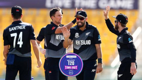 Afghanistan banked on their attack when they chose to bat first, with mystery spinner Mujeeb Ur Rahman back in the lineup after recovering from injury. They needed a decent batting Powerplay, though, and could hardly have done any worse. Mohammad Shahzad was the first to go, trying to larrup an Adam Milne bouncer over third man, and managing only to send an edge through to wicketkeeper Conway (who did excellently to get a glove behind it, and complete the catch on the second rebound), in the third over. Trent Boult then had Hazratullah Zazai caught at short midwicket. Soon after, Tim Southee had Rahmanullah Gurbaz lbw. After six overs, Afghanistan were 23 for 3, and had struck just three boundaries - one of which was an unintentional top edge.