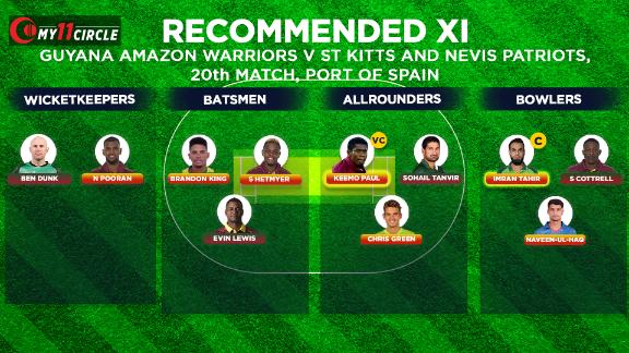 Evin Lewis looked in all sorts of pain batting at No. 7 after a groin injury on Saturday night, but was named in the Patriots side at the toss, while Sheldon Cottrell missed out due to a niggle. But it was a real shock to see Chris Lynn left out, even after 73 runs in six innings, and fellow overseas player Nick Kelly was also left to carry the drinks.