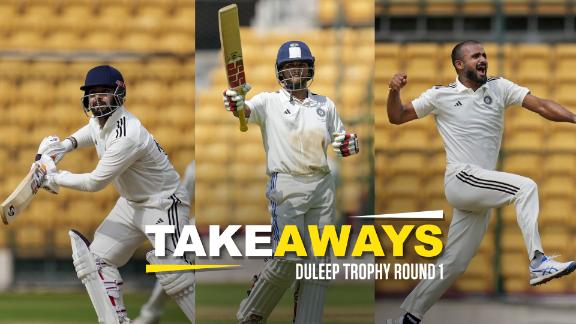 Sarfaraz was eyeing a half-century, perhaps more. In trying to keep at it, he slashed one to Jurel. Avesh, who had bantered with him earlier, leapt past Sarfaraz in celebration and gave him a send-off. Sarfaraz made 46 off 36; he had put on 72 off 55 with Pant; India B's lead had swelled to 184. The partnership was over, but the party wasn't.