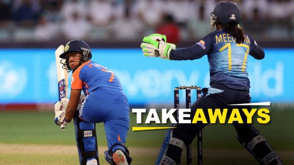By then, Harmanpreet, with a cushion of a long batting line-up to follow, cut loose. She first paddled Kanchana past short fine leg before hitting two fours to spoil Athapaththu's figures. Ranaweera could not hang on to a powerful hit at cover when Harmanpreet was on 22. She hit Kanchana and Prabodhani for two fours each in the last two overs to bring up only her third half-century in T20Is since the 2023 T20 World Cup. That blitz - 52 not out off just 27 balls - helped India take 46 off the last four overs, the most by any team in this T20 World Cup.