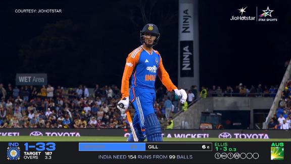 Shubman Gill misses a full delivery from Nathan Ellis and is trapped leg before