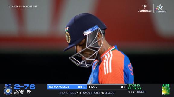 Suryakumar Yadav is undone by a slower delivery from Marcus Stoinis as he lofts it to the man at cover