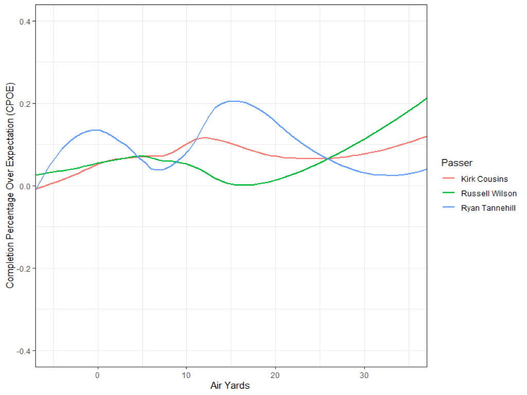 Completion percentage over expectation by depth of target for CPOE's top three quarterbacks. Data via NFL Next Gen Stats.Seth Walder6y ago