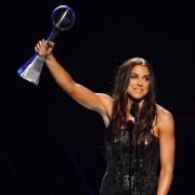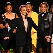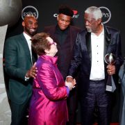 Megan Rapinoe and the U.S. women's national soccer team started their day with a parade in New York and ended it by accepting the ESPY for Best Team in Los Angeles.  Billie Jean King congratulates Bill Russell after he was presented with the Arthur Ashe Courage Award by Kobe Bryant. Legend-in-the-making Giannis Antetokounmpo, who won Best Male Athlete and Best NBA Player, shares the moment with the icons.  Kobe Bryant holds the stage during a tribute to NBA legend Bill Russell.  "Tonight I'm selling fruit snacks for Jimmy V," ESPYS host Tracy Morgan says.  Honorees for the inaugural Billie Jean King Youth Leadership Award are recognized by the ESPY crowd.  Even though Kansas City was on the losing end, Chiefs QB and NFL MVP Patrick Mahomes warmly greets Rams QB Jared Goff on the stage at they are honored with the Best Game ESPY for their epic 54-51 Monday Night Football shootout.  Fresh from a World Cup win, Alex Morgan declared that her win for Best Female Athlete was the "second-best trophy we won this week."  St. Louis Blues' Ryan O'Reilly goes full-throttle hockey as he takes out his tooth to accept the ESPY for Best Comeback.  Sgt. Kirstie Ennis delivers an emotional speech on strength, hope and service as she accepts the Pat Tillman Award for Service.  Odell Beckham Jr. greets former teammate Saquon Barkley, who was named Best Breakthrough Athlete.