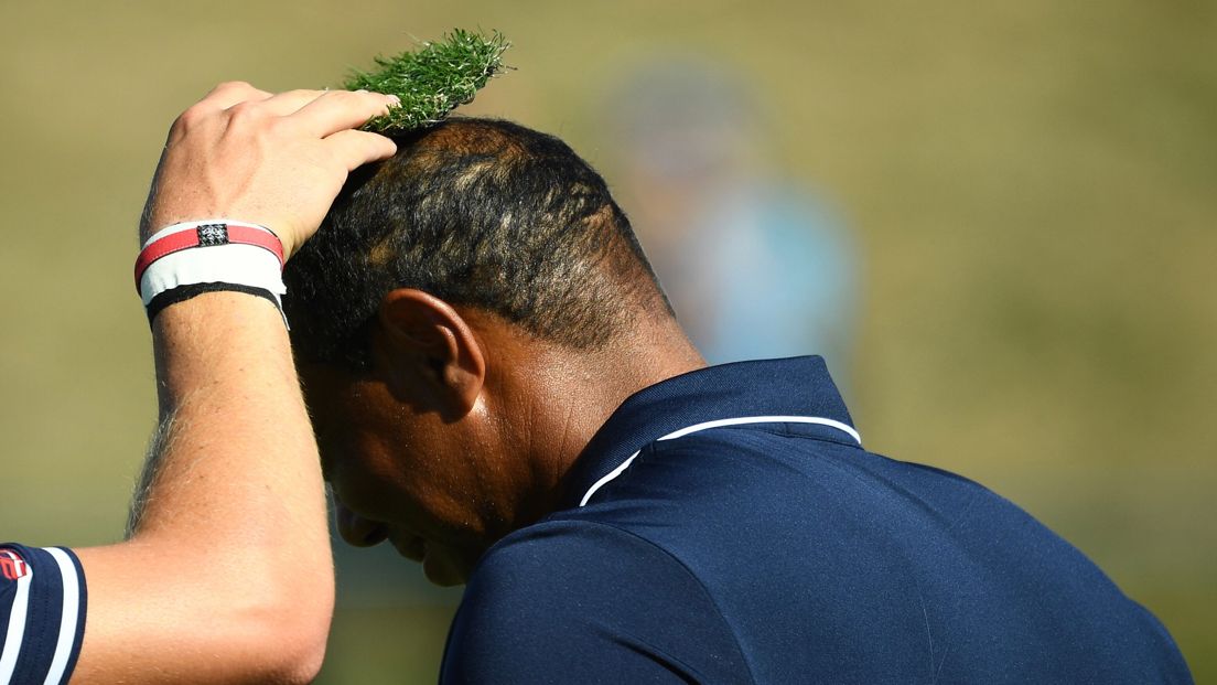Both myself and Scott Van Pelt have tried to talk Tiger Woods into shaving his head, Tiger continues to seek alternative solutions to baldness! This was Justin Thomas' contribution. Photo credit-Getty Images.