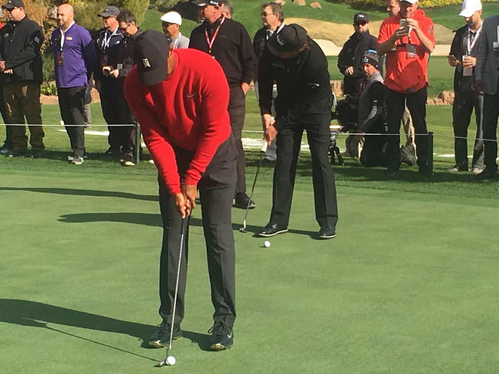 Tiger and Phil getting in some work on the practice putting green prior to The Match at Shadow Creek.