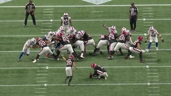 Josh Allen throws up the middle, but gets intercepted by Falcons' Dee Alford.