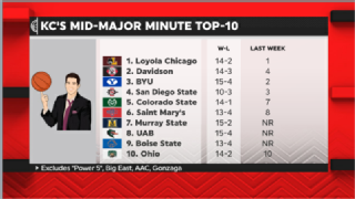 KC's Mid-Major Top 10 for this week:   1. Loyola Chicago Ramblers (Missouri Valley)Last week: 1 For the third consecutive week, the Ramblers occupy the top spot following road wins over Indiana State and Evansville, and that other poll could no longer ignore the elephant in the room. Loyola cracked the AP Top 25 for the first time all season, coming in at No. 22. In doing so, coach Drew Valentine became the youngest head coach (30) to lead his team into the AP poll since Cal's Todd Bozeman (29) in November 1993. (Having Jason Kidd helped.) You have no one to blame but yourself if you miss Saturday's home showdown with Missouri State. Next up: vs. Missouri State (Saturday)  2. Davidson Wildcats (Atlantic 10)Last week: 4 Friday's battle with Richmond inside the Robins Center was a gift from the mid-major gods. Michael Jones was unconscious, connecting on 8 of 9 3s, including the game winner with 3 seconds to play in an electrifying 87-84 decision. The Wildcats chased that with a stirring, come-from-behind win on Tuesday at VCU, holding the Rams to two points over the final 5:23. Davidson is now 15-2 and 5-0 in Atlantic 10 play and off to its best start since the 1969-70 season. Next up: at Fordham (Saturday)  3. BYU Cougars (WCC)Last week: 2 There's no sugarcoating what happened to the Cougars on Thursday in Spokane, Washington. Gonzaga happened. The new AP No. 1 team shot 69%, made 11 3s, got 30 points from national player of the year candidate Drew Timme and hung 110 on BYU in a 26-point win. Yikes. But 48 hours later, Mark Pope's squad got back inside the octagon and beat last week's No. 6-ranked team, San Francisco, 71-69 in the Dons' gym. Talk about a good chin. After a few days of raw steak on the eyes to reduce swelling, BYU returns to action Thursday against middleweight contender San Diego. Next up: vs. San Diego (Thursday)  4. San Diego State Aztecs (Mountain West)Last week: 3 The Committee lost sleep over this move. Dropping a team two spots after it didn't play (through no fault of its own) was excruciating but warranted. Tuesday's run with UNLV was postponed due to COVID-19 concerns within the Aztecs' program, giving coach Brian Dutcher's team just two games since the calendar flipped to 2022. That said, it's about to get real. SDSU is home to our No. 9 team Boise State this weekend, Monday is the rescheduled game with UNLV and Wednesday is a road test at Utah State. Three games in five days. Saddle up. Next up: vs. Boise State (Saturday)  5. Colorado State Rams (Mountain West)Last week: 7 The Rams have stabilized after that 30-point loss at San Diego State. Coach Niko Medved's squad won by 36 at San Jose State on Saturday, then scratched out a hard-fought home win over New Mexico on Wednesday night. CSU still has just one loss, to go with a Quad 1 win (Saint Mary's) and a 3-0 record in Quad 2 games (Creighton, Mississippi State and Utah State.) David Roddy remains a top contender for Mountain West Player of the Year. Next up: at Air Force (Saturday)  6. Saint Mary's Gaels (WCC)Last week: 8 The Gaels got back on the horse following a clunker on Saturday at BYU, with a 77-62 win on Thursday at Pepperdine. Coach Randy Bennett's team might lack sex appeal, but the Gaels sure have a great personality. Three of SMC's four losses have come at the hands of teams ranked in this very Top 10 (Colorado State, San Diego State and BYU), and the other was to Wisconsin. Wins over Notre Dame, Oregon, Utah State and Missouri State bolster this résumé. Next up: vs. Santa Clara (Thursday)  7. Murray State Racers (Ohio Valley)Last week: Unranked Former Racer Ja Morant has taken home two of the past three NBA Western Conference Player of the Week honors, but there's no recognition on par with a spot in KC's Mid-Major Top 10. Coach Matt McMahon's team sandwiched dominant victories over Tennessee State (Thursday) and Eastern Illinois (Monday) around an eye-opening 22-point road win over our No. 5-ranked Belmont Bruins on Saturday. Justice Hill erupted for a career-high 36 points in Belmont game, establishing an OVC season high in the process. Next up: vs. UT Martin (Saturday)  8. UAB Blazers (Conference USA)Last week: Unranked There's simply no more ignoring the season the Blazers are having. Jordan Walker went for 20 points in an 84-56 thumping of FIU then established a career high with 27 points in an 11-point victory over Florida Atlantic. Coach Andy Kennedy's team has two Quadrant 1 wins (at Saint Louis and at North Texas), and if not for a puzzling road loss versus Rice, it might be ranked even higher. Missing Saturday's visit to Louisiana Tech will be seen as an affront to The Committee and an offense to your own self-dignity. Next up: at Louisiana Tech (Saturday)  9. Boise State Broncos (Mountain West)Last week: Unranked Make it 10 straight W's for the Broncos, who knocked off New Mexico and Air Force this past week. It's now the second-longest win streak in program history, and only Davidson and Auburn have longer active win streaks in Division I. Coach Leon Rice's squad ranks 22nd nationally in defensive efficiency and has held 10 teams to under 60 points. But beware of the road ahead. Boise State faces Utah State, San Diego State, Wyoming and Fresno State over the next nine days. Next up: at San Diego State (Saturday)  10. Ohio Bobcats (MAC)Last week: 10 Saturday's run at Central Michigan was postponed, so the Bobcats' lone game of the week was Tuesday at Miami (Ohio), and they did not disappoint. Ben Vander Plas posted a season-high 23 points and helped Ohio extend its win streak to nine games in an 86-63 decision in Round 1 of the "Battle of the Bricks." Friday's clash with Toledo might be the biggest game at the Convocation Center all season. Next up: vs. Toledo (Friday) Others receiving votes: San Francisco, Wyoming, Belmont, New Mexico State, Louisiana Tech Dropped out: Belmont (No. 5), San Francisco (No. 6), St. Bonaventure (No. 9) ESPN Stats & Information researcher Jared Berson c