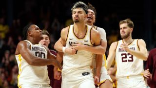 MINNEAPOLIS -- Dawson Garcia began calling for the ball before he crossed half court. Once he got it, he let it fly to give Minnesota its first Big Ten victory of the season. Garcia's 3-pointer from the near edge of the center logo beat the overtime buzzer to give Minnesota an 84-81 victory over No. 20 Michigan on Thursday night. Garcia, whose two free throws with 7.4 seconds left sent it to overtime, spent much of the game banging on the inside at both ends of the court against Michigan's twin towers, 7-footers Danny Wolf and Vladislav Goldin. In fact, just before his buzzer-beater, Garcia was taken to the hoop by Wolf for a layup that tied it at 81 with seven seconds to play. Gophers coach Ben Johnson called a play during the previous huddle just in case the game came down to one more possession. But Patterson bobbled the inbounds pass and didn't have a chance to set up the play.  Instead, Lu'Cye Patterson brought the ball into the frontcourt, then passed to Garcia, who was trailing on the play. The 6-foot-11 senior, had his back heel on the "M" logo when he launched a high-arcing jumper that splashed through the net as the buzzer sounded, touching off a wild moment as both his teammates and fans stormed the court to celebrate. "It's a little bit of broken play, combined with they kind of know the concepts of what we're trying to do," Johnson said. "And they read it great." Patterson initially had a different outcome in mind. "I was just trying to get to the cup," Patterson said. "But [Garcia] wanted it, and I lined it up for him. I tried to put the ball in the right place for his hands and he did it. I trust him, you know, like he's my brother, so it was a no-brainer for me." Garcia wasn't exactly sure how far past the half-court line he'd made it before shooting. "I didn't know initially," he said, "but I looked back and I was like, 'I think I was at the logo!'" Garcia finished with 27 points and 12 rebounds to lead the Gophers (9-10, 1-6).
