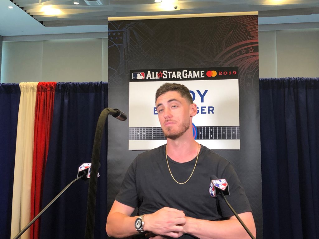 Cody Bellinger contemplates whether he'd rather be stuck in an elevator or a ski lift (ski lift) and if he'd rather eat dinner in a restaurant by himself or go to a concert by himself (dinner) because these are the important questions that get answered on All-Star Media Day.