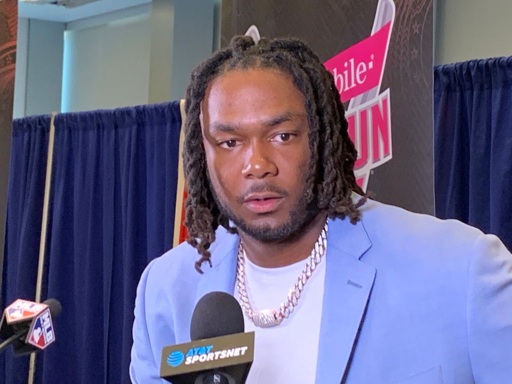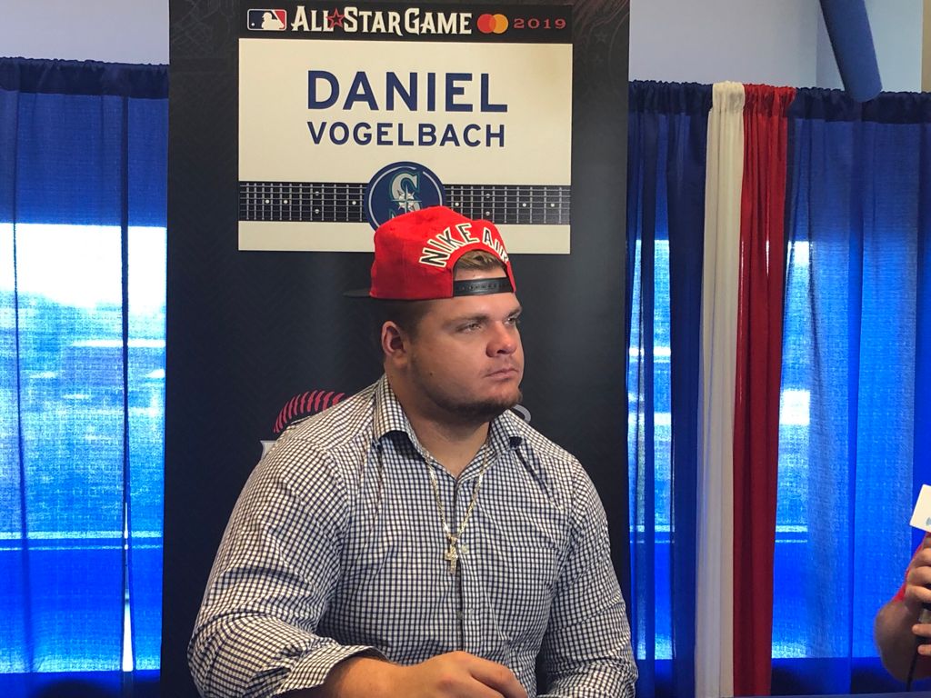 Daniel Vogelbach is rocking the old-school Nike Air hat backwards for his first All-Star media session.