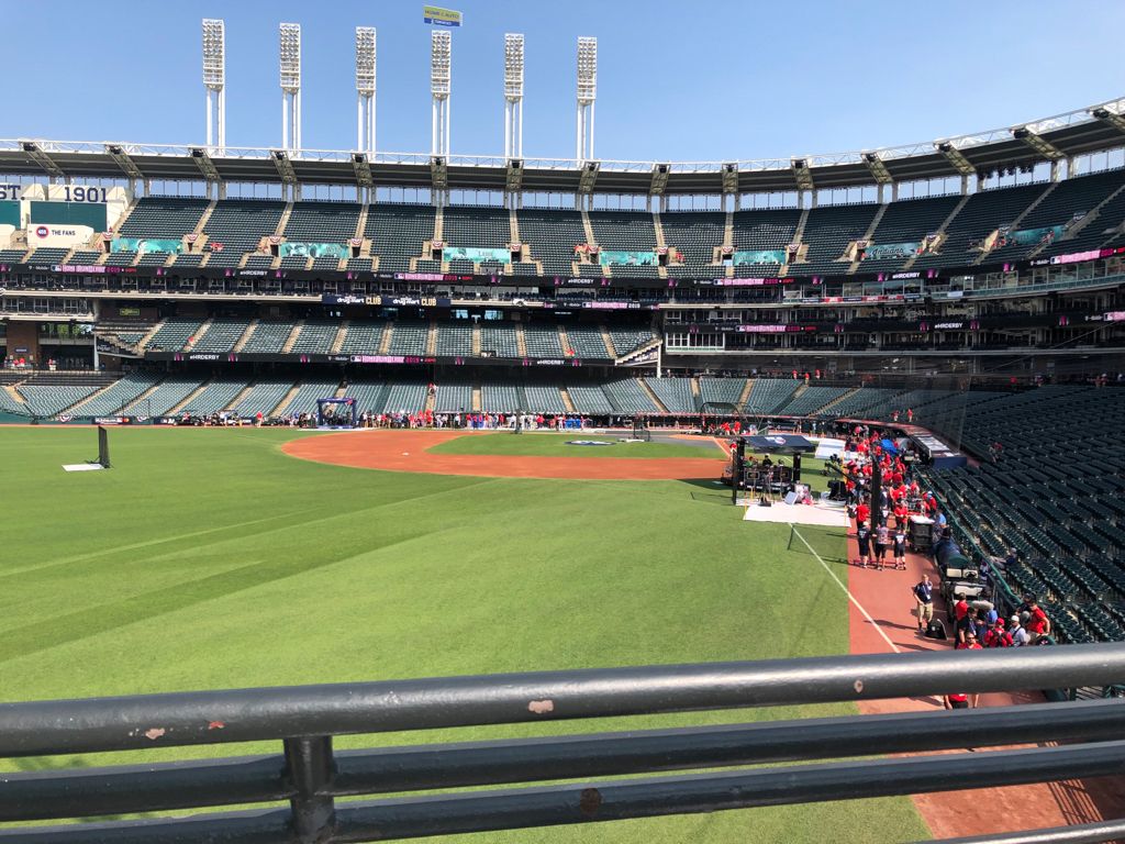 The Progressive Field bleachers are starting to fill up as the AL works out on the field.