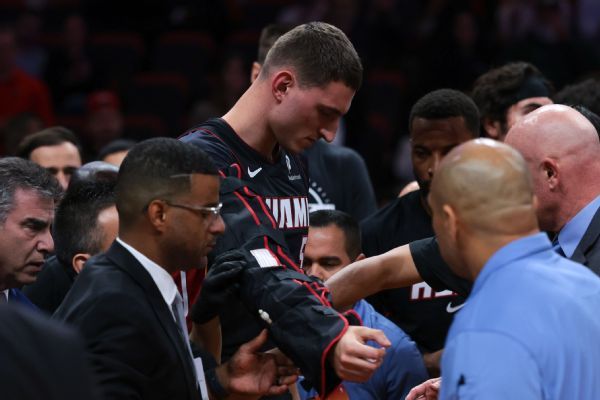 Heat forward Nikola Jovic, who left Monday night's game with a splint-like device over his right arm after taking a hard foul, underwent an MRI that revealed a right elbow contusion/laceration, the team said.