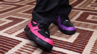 The "sandwich method" in fashion is when someone balances their look by matching their top with the shoes (the pieces of bread) and contrasting the look with a different-colored bottoms (the filling). Clifford did just that but in the most creative way. To pair with his pink, purple and white ombre jacket, he rocked custom pink and purple Nike Air Force 1s.